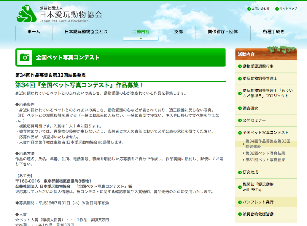 日本愛玩動物協会による「全国ペット写真コンテスト」の作品募集が行われています。昨年の受賞作をみると、ステキな写真ばかり。あなたも応募してみては?日本…